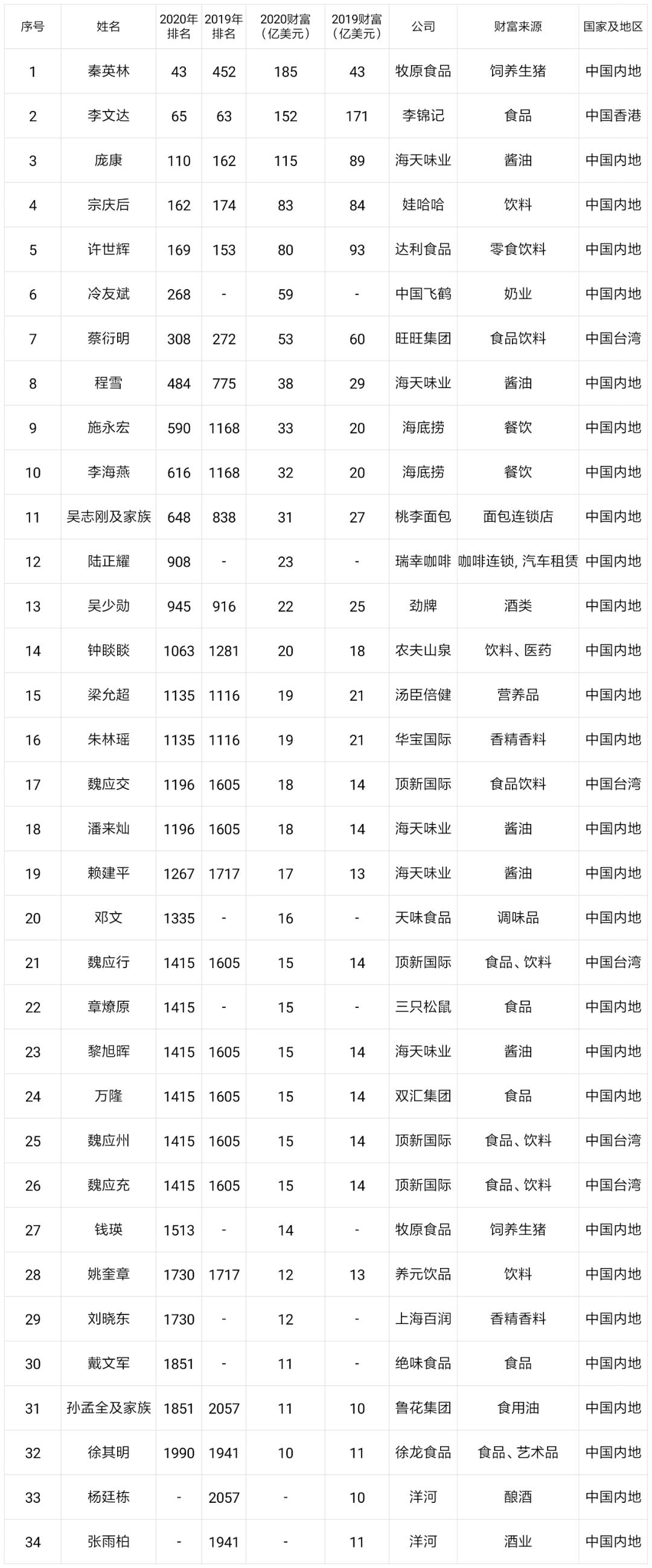 中国和全球食品业最富的那批人是谁?他们身家10亿美元起跳