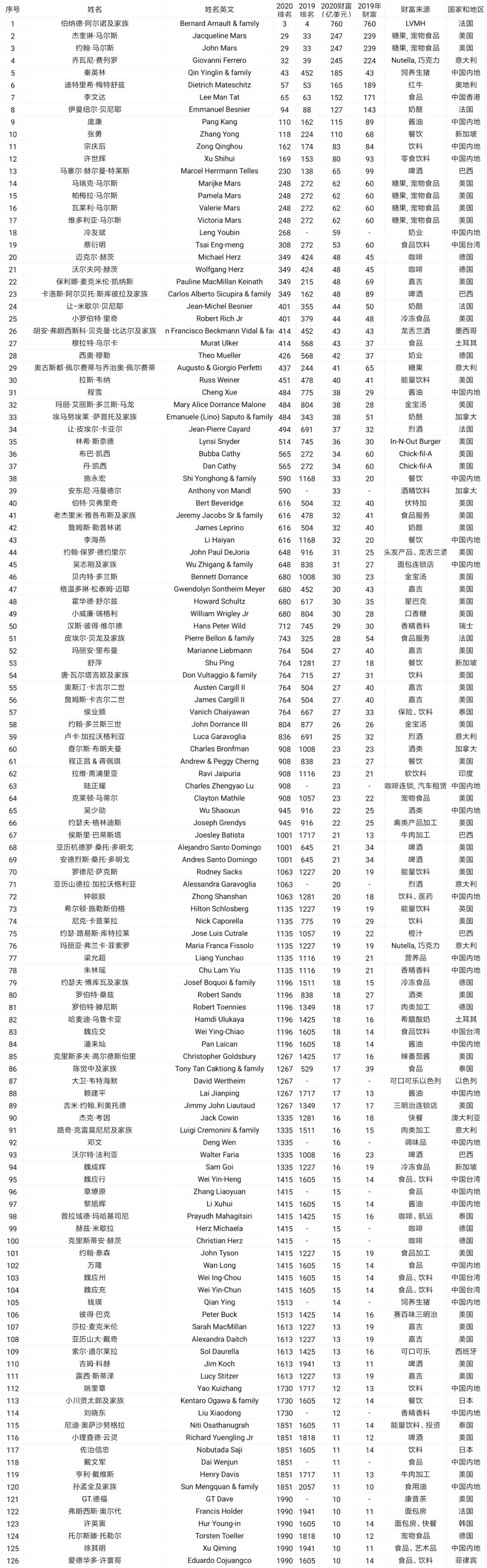 小食代留意到,其中许世辉(达利食品),陈觉中(快乐蜂),伊曼纽尔·贝尼耶(兰特黎斯), 马塞尔·赫尔曼·特莱斯(百威集团),埃马努埃莱 ·萨普托及家族(萨普托),布巴·凯西(Chick-fil-A),丹·凯西(Chick-fil-A),迪特里希·梅特舒兹(红牛)的财富下降均超过10亿美元。