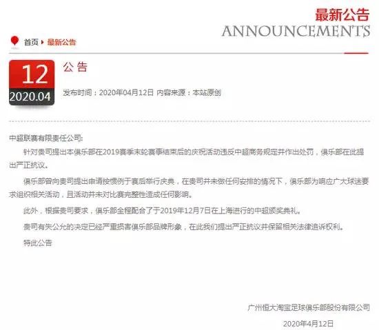 经上港俱乐部申诉,中超董事会开会讨论后将罚单降至20万。据悉,恒大、上港受罚都发生在很久之前,而4月9日会议上只是旧事重提。根据俱乐部拥有48小时申诉期的原则,恒大并未在规定时间内上诉。尽管恒大4月12日发布官方公告抗议,但实则已经接受了50万罚金的现实。