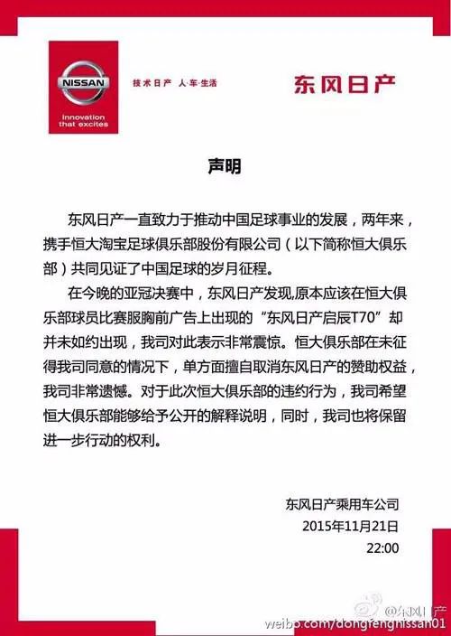 恒大2015亚冠决赛"换胸"与东风日产对簿公堂,曾称违约是合约一部分
