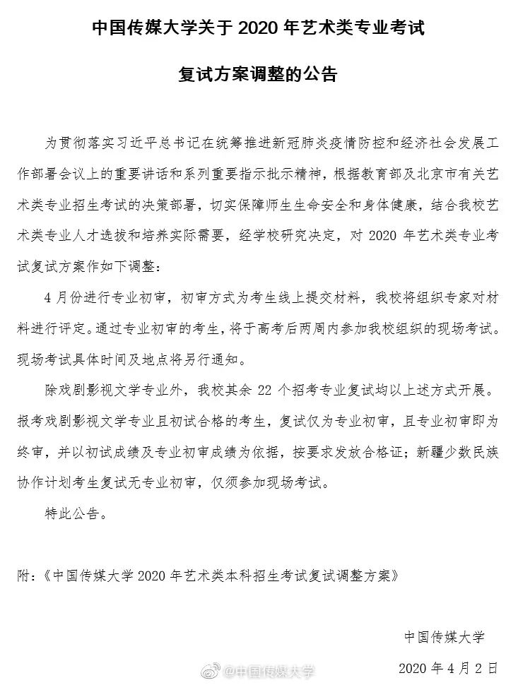 到了3月底、4月初,全国高校针对艺术类专业招生考试的调整计划陆续推出。截至毒眸发稿前夕,全国范围内已经有包括中国传媒大学、中央戏剧学院、上海戏剧学院等在内的多所艺术类高校,为应对疫情发布了全新的招考计划。