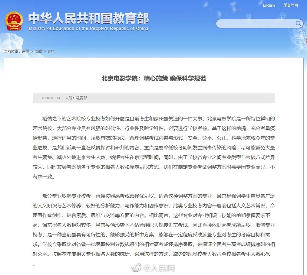 北京电影学院取消校考的通知(图片来源@微博人民网)
