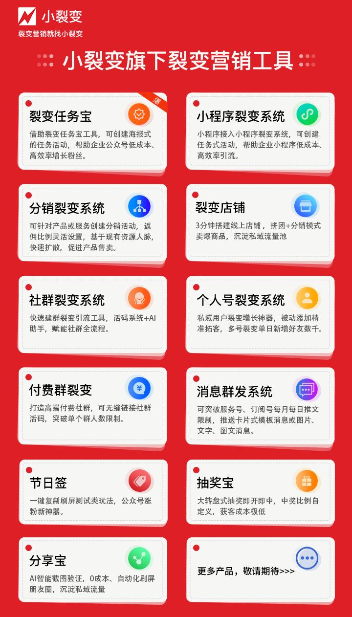 针对微信生态的四大流量触点:公众号、个人客服号、社群及小程序,小裂变开发了包括了公众号裂变系统、小程序裂变系统、分销裂变系统、社群裂变系统、个人号裂变系统、裂变店铺系统等主要产品在内的产品矩阵。针对不同客户的不同需求,小裂变为他们提供量身定制的裂变增长方案。