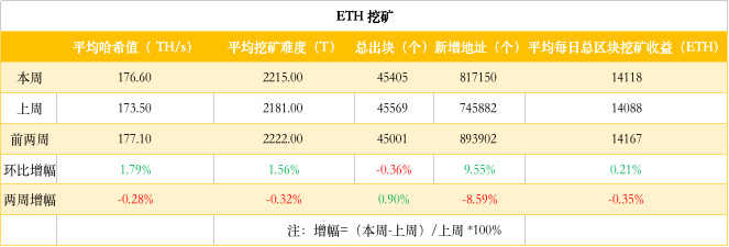 etherchain.org 数据显示,平均算力环比上涨 1.79%,暂报 176.6 TH/s;挖矿难度环比上涨 1.56%,暂报 2215 T;矿工活跃度增加,新增地址环比上涨 9.5%。