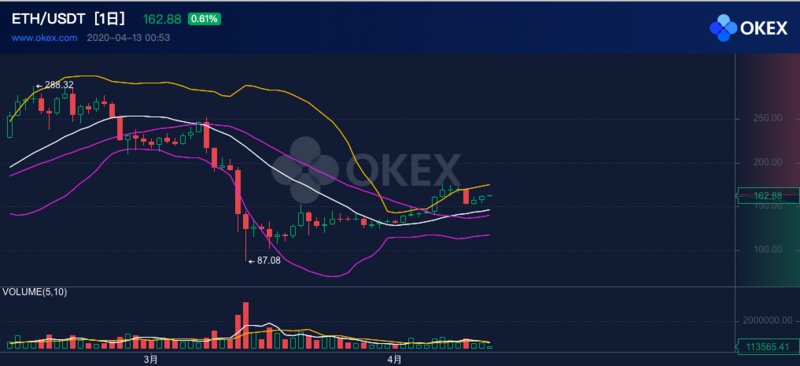ETH 日线图上显示,目前价格始终位于破布林带中轨和上轨之间,形成看涨格局;支撑位是布林带中轨,暂报 150 美元;阻力位是200日均线,暂报 170 美元。