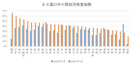 在国内疫情较为严重、各地防控疫情措施严厉的2月份,全国道口中小微经济恢复指数为33.3%。随着全国各地疫情控制获得显著效果以及复工率的逐步上升,全国中小微企业在3月份的营业额相比于2月份有大幅增长(增加了约3000亿元),环比增长了141.4%,道口中小微经济恢复指数上升至41.1%。