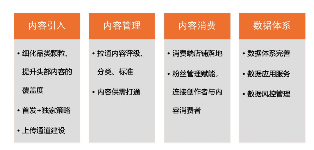 在自身建设上,除了上述产品外,还有标准化、组件化建设,以及支撑内部运营的工具建设。分别可以从内容引入、内容管理、内容消费以及数据体系建设上进行细化。