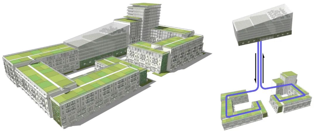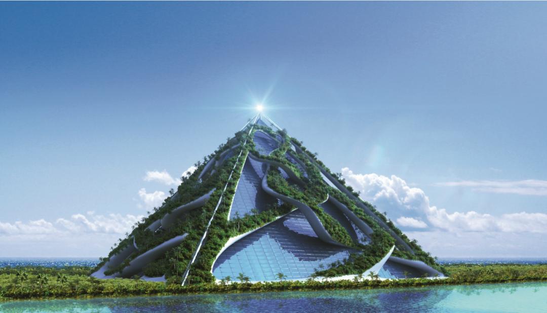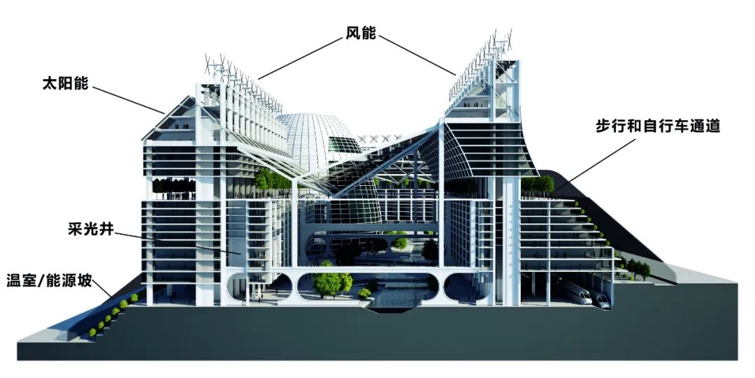 可以看到其顶部有大量的太阳能电池板和风车,所以城市中的主要能源就是太阳能和风能。此外,建筑脚下的能源坡也能进一步利用太阳能,不仅让温室中的植物获得光照,还能收集太阳能。这样的能源组合将提供所需能源的80~100%。