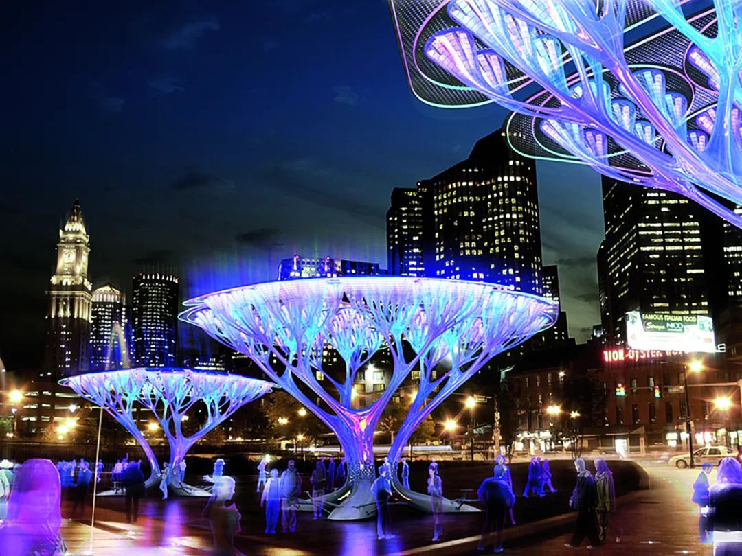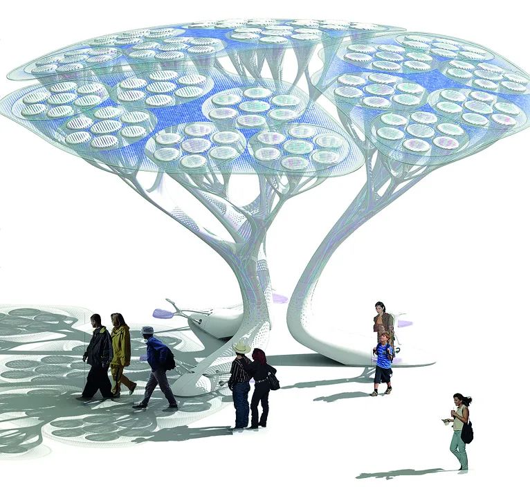 没错,在我沉睡前就有了人造树的雏形。比如在2010年,美国波士顿市曾经设计过一个人造树(treepod)。它是模仿龙血树的造型,可以照到更多的阳光,让顶部的太阳能电池板为捕捉二氧化碳提供尽可能多的能量。
