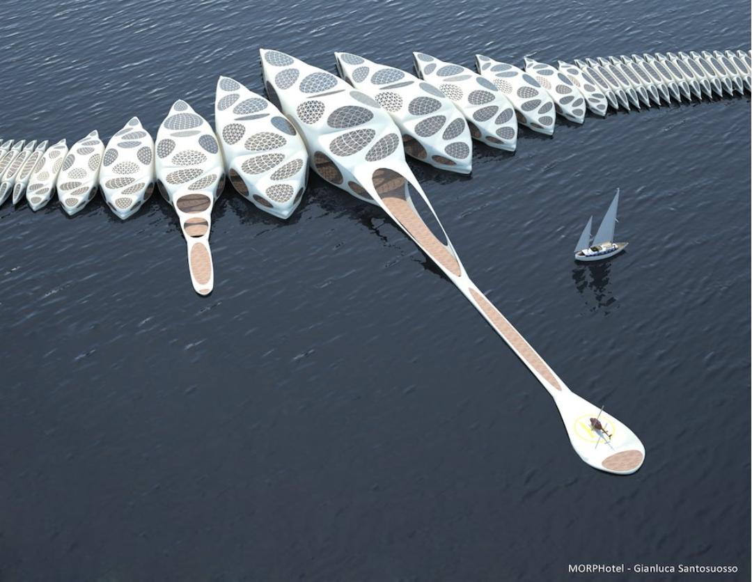 除了陆地,现在海上也有不少超级建筑。在海平面上升后,人类并没有被海洋赶到更小的陆地上,有一些人在海面的城市里住了下来。海上城市建筑的设计思路,也是继承自曾经的生态建筑设计,不过最初仅仅是作为娱乐设施。比如 MORPHotel,就是一个漂浮在海上的豪华酒店。