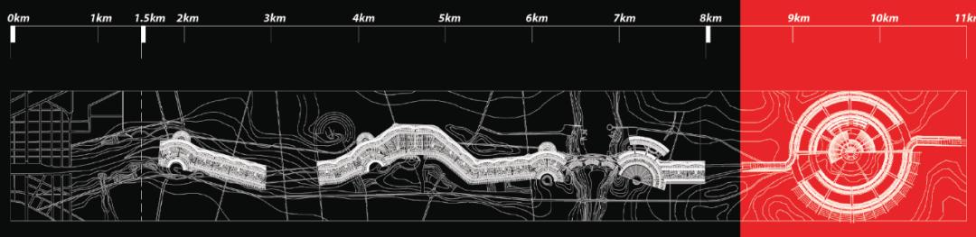 上图中像城墙一样的建筑就是线形生态城市的主体结构,由一节一节的模块组成。每个模块大约200米长,分为左右平行的两部分,其高度超过20层楼高,可以容纳3000个人在其中生活。