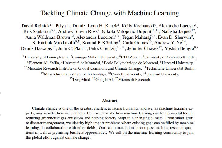 共同发表了一篇题为《用机器学习应对气候变化》的论文,其中包含 650 篇参考文献。
