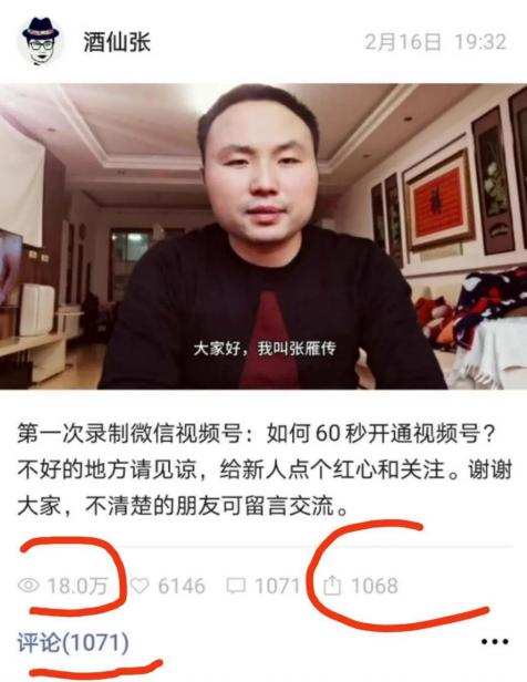 第一个作品就“爆”了,是酒仙张没有想到的。2月16日,他发布了第一个视频,内容以如何开通视频号为主题。他隐约感觉到,在红利期最吸引人的内容是,如何开通视频号以及相关教学。