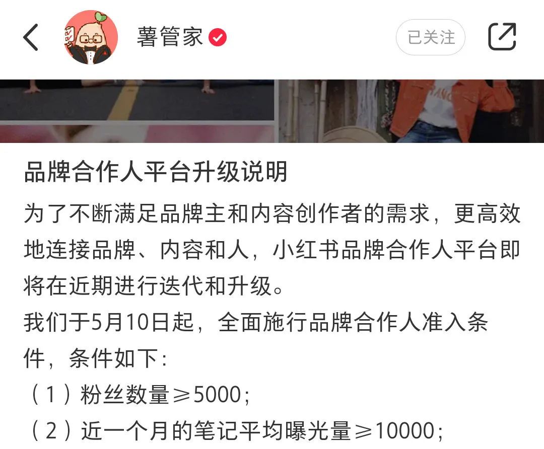 直到2019年5月,小红书发布了一则令广大创作者颇不淡定的《品牌合作人平台升级说明》,要求品牌合作人必须拥有5000及以上的粉丝,且近1个月笔记的平均曝光量至少达到10000,否则将被取消资格。