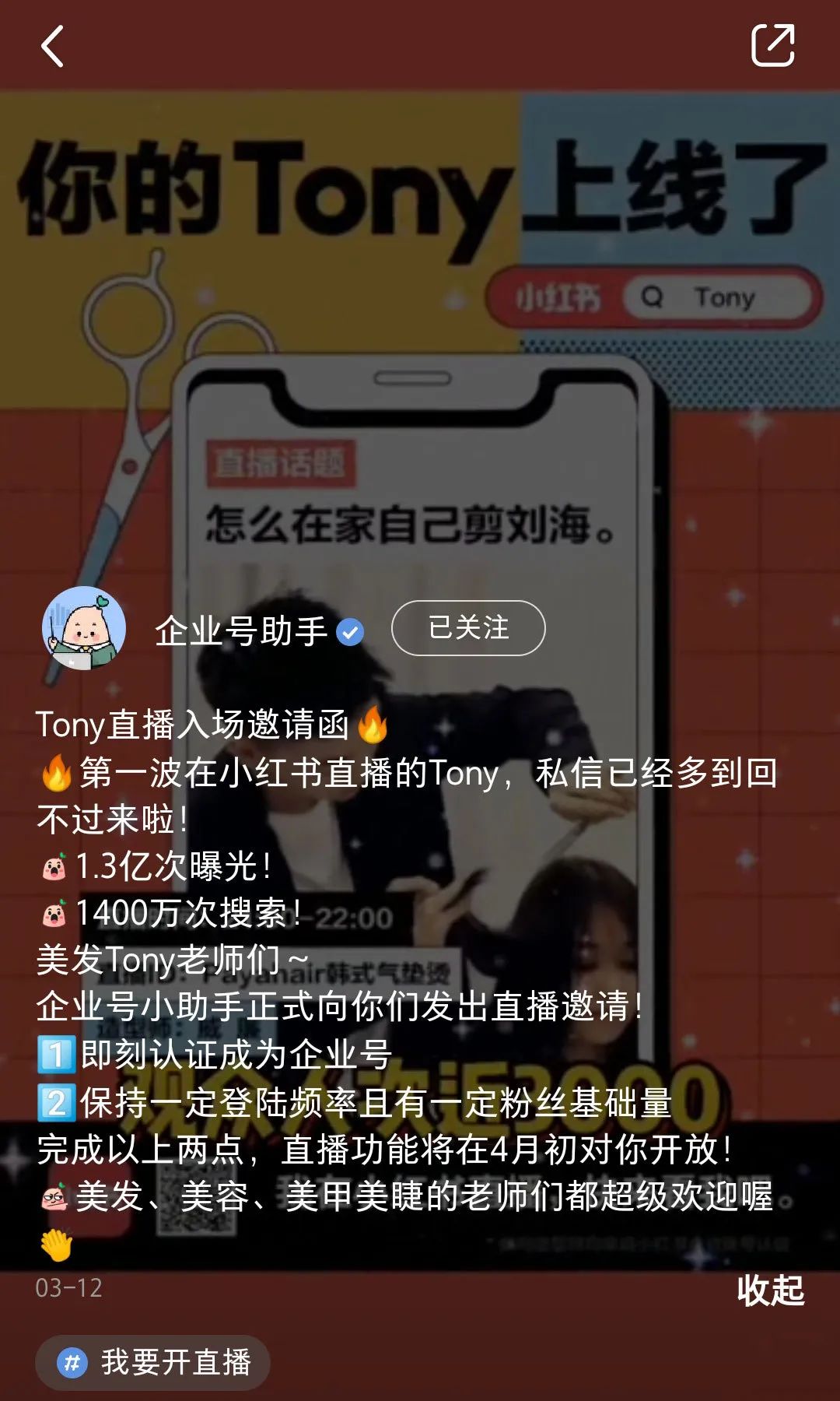 此前,小红书“企业号助手”曾发布了一篇《Tony直播入场邀请函》的视频笔记,邀请美发、美容、美甲、美睫行业的创作者加入直播大军,宣布企业号直播功能将在4月初正式上线。