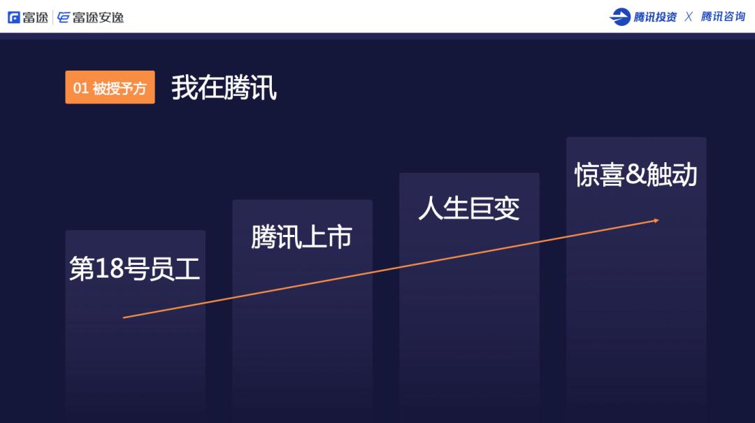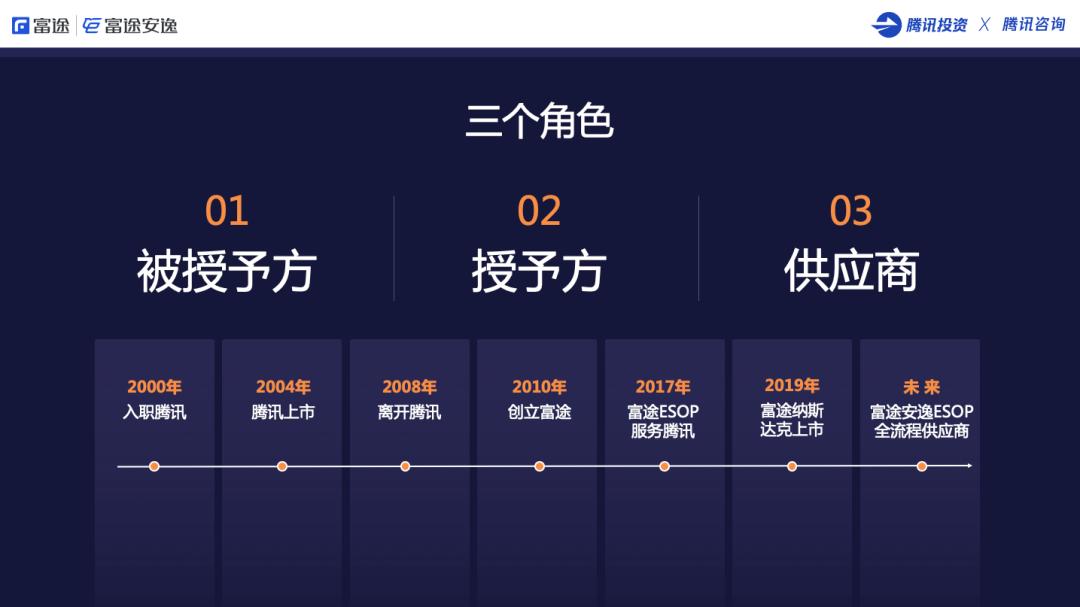 从我2000年参加工作到现在,我非常凑巧地经历了和股权激励相关的三个角色,作为腾讯的员工,我是股权激励的被授予方;作为富途的创始人,我是股权激励的授予方;后来富途又新增了企业服务业务“富途安逸”,为企业提供IPO分销和ESOP解决方案,我又成了股权激励设计及方案实施的服务商,所以在今天的分享中,我想和大家分享在不同角色阶段,我与股权激励的三个故事。