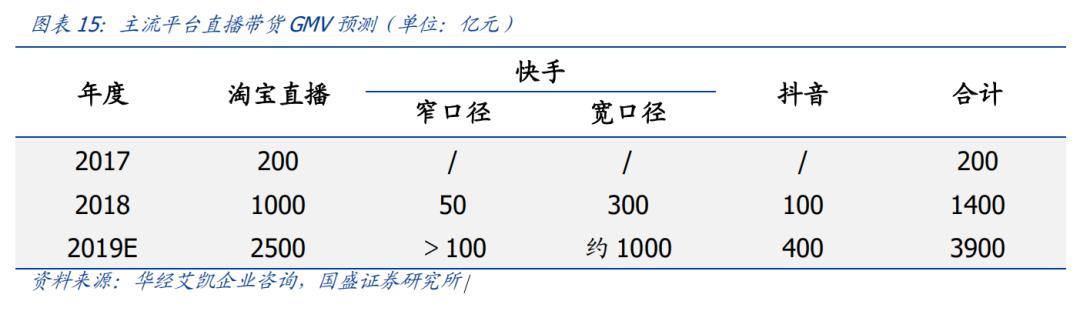 除了上述的淘宝,2019 年快手直播平台内GMV在100亿元以上(自有店铺、魔筷、有赞等可检测部分);若考虑主播导到淘宝和自己微信上成交的部分,整体GMV约1000亿元,与2018年淘宝直播规模基本持平。此外,抖音2019年GMV总目标为400亿元。