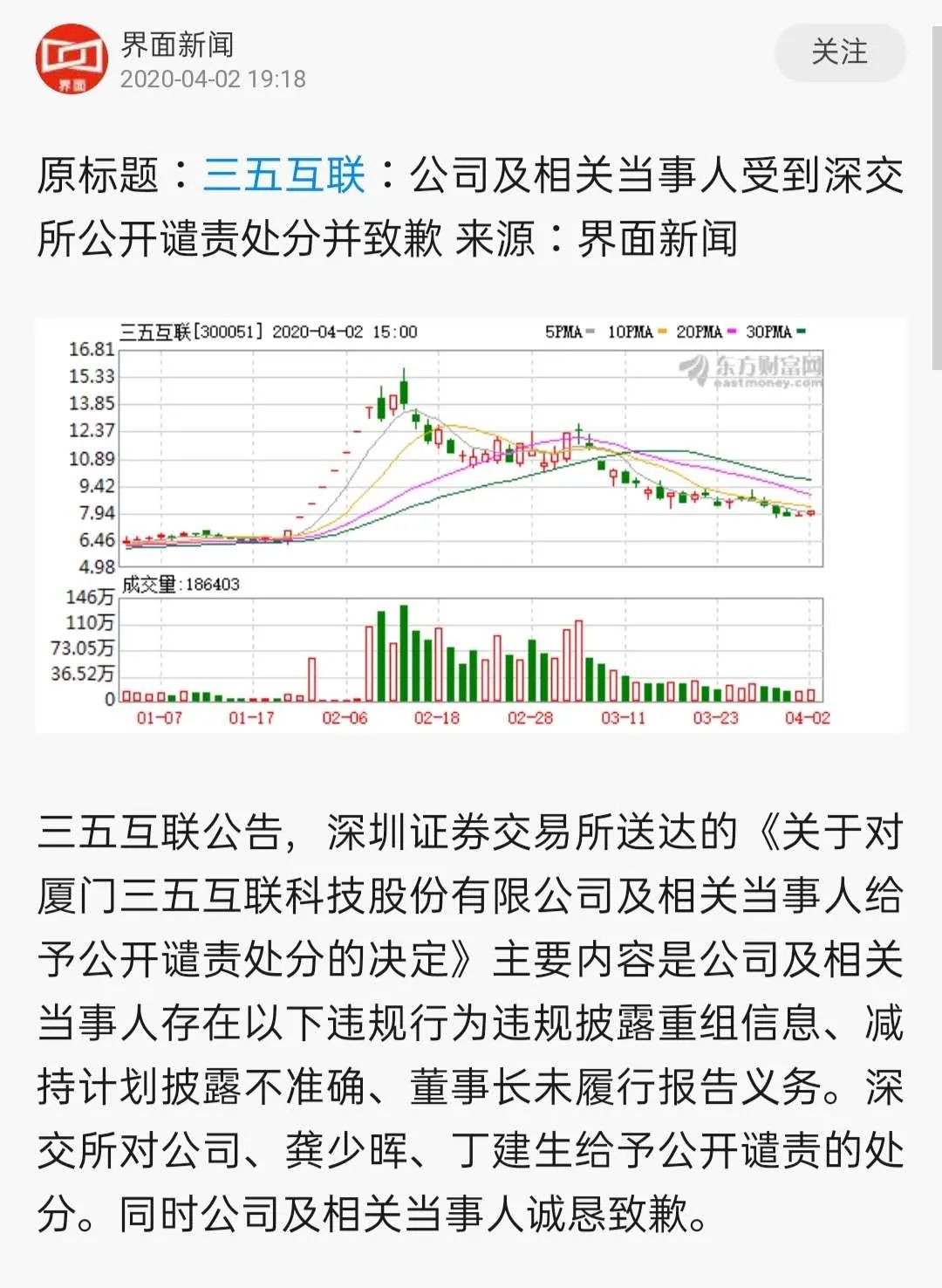 今年1月22日,三五互联未经停牌就披露了公司拟通过发行股份及/或支付现金的方式收购婉锐(上海)电子商务有限公司100%的股权一事。4月初,因未经停牌就披露收购计划等违反一系列规定的动作,三五互联实控人龚少晖以及董事长兼总经理、时任董事会秘书的丁建生被深交所给予公开谴责的处分。