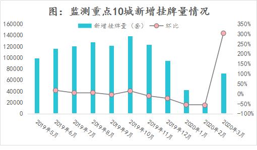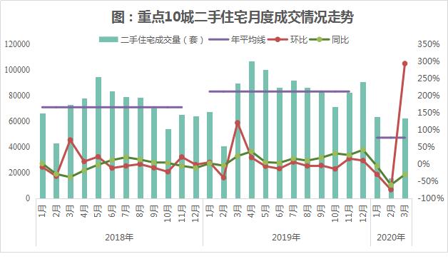 据诸葛找房数据研究中心统计:2020年一季度10个重点城市二手住宅成交量仅为14.17万套,同比下跌28.54%,环比下跌42.18%,同环比均大幅下跌;一季度10个重点城市成交量创2013年以来历史新低。3月份受益于政府有利的管控,疫情得到有效的控制,各地也逐渐开复工,市场走出低迷成交量回升明显;3月份10个重点城市成交6.24万套,同比下跌30.60%,成交量回升至正常水平的7成左右,一季度成交量呈现明显的“V”走形。