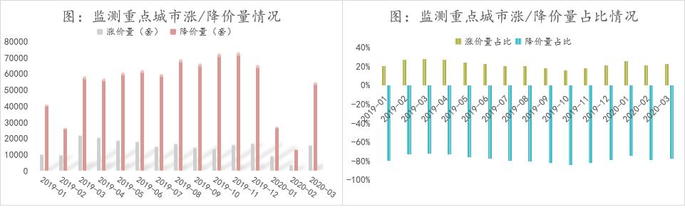 3月份业主活跃度恢复,调价行为也随之增多,3月份监测重点10城总调价房源量为7.10万套,相比上月调价行为大幅增加,但仍不及去年底。从涨降价房源占调价房源占比情况来看:整个市场仍以降价出售为主,3月份降价房源量占比为77.31%。3月份涨价房源量占比相比2月份有所上涨,3月份涨价房源量占比为22.69%,环比扩大1.81个百分点,小部分业主很看好市场,上调房源价格。