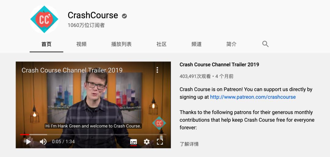 图注:Crash Course(译:速成课程)频道首页(来源:YouTube)