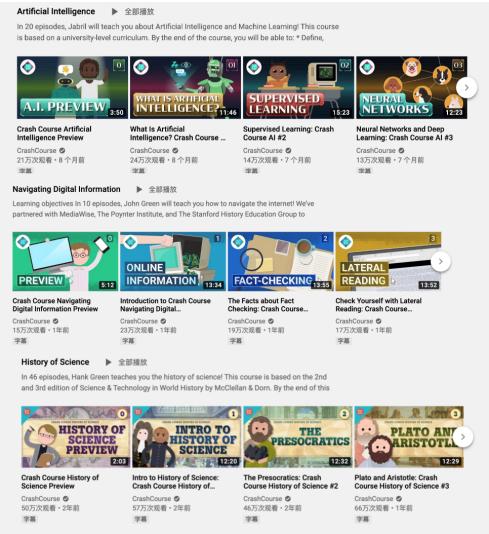 图注:Crash Course知识类视频拥有不同的分类(来源:YouTube)