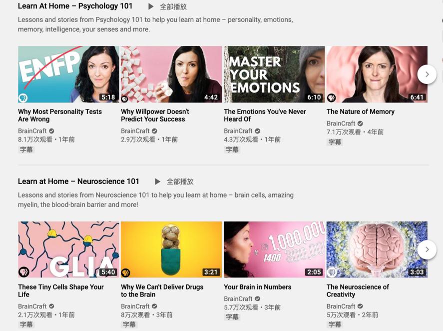 图注:Brain Craft主页,在家学习系列的视频按不同主题进行分类(来源:YouTube)