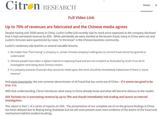 这是继续做空机构Grizzly Research之后,4月14日晚间,美股开盘仅半小时,做空机构香橼研究公司(Citron Research)也发布了跟谁学的做空报告,质疑跟谁学2019年虚增70%收入,并呼吁该公司立即停止股票交易并开展内部调查。