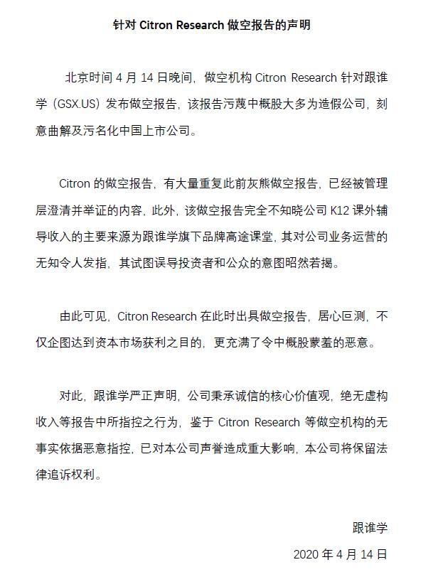 随后,跟谁学官方连夜发表声明表示,绝无虚构收入等报告中所指控之行为。香橼大量重复此前灰熊做空报告,已经被管理层澄清并举证的内容。此外,该做空报告完全不知晓公司 K12 课外辅导收入的主要来源为跟谁学旗下品牌高途课堂,其对公司业务运营的无知令人发指,其试图误导投资者和公众的意图昭然若揭。鉴于做空机构的无事实依据恶意指控,已对本公司声誉造成重大影响,本公司将保留法律追诉权利。