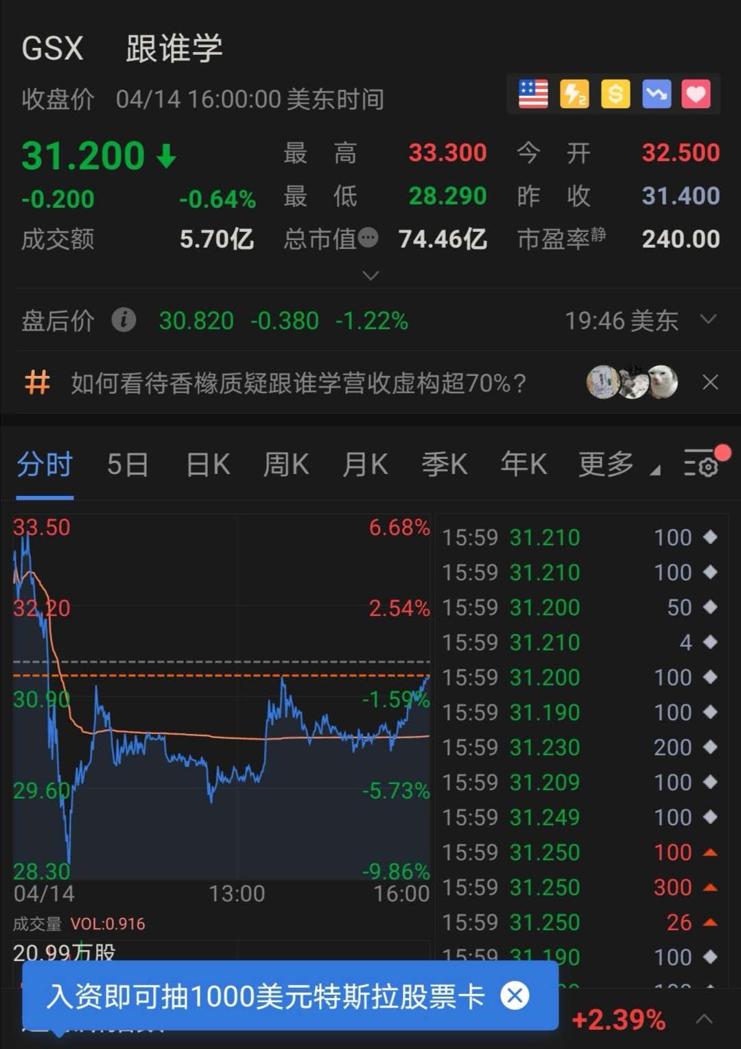 报告一经发布,跟谁学股价迅速大跌10%,最终收报31.2美元,跌0.64%,市值74亿美元。