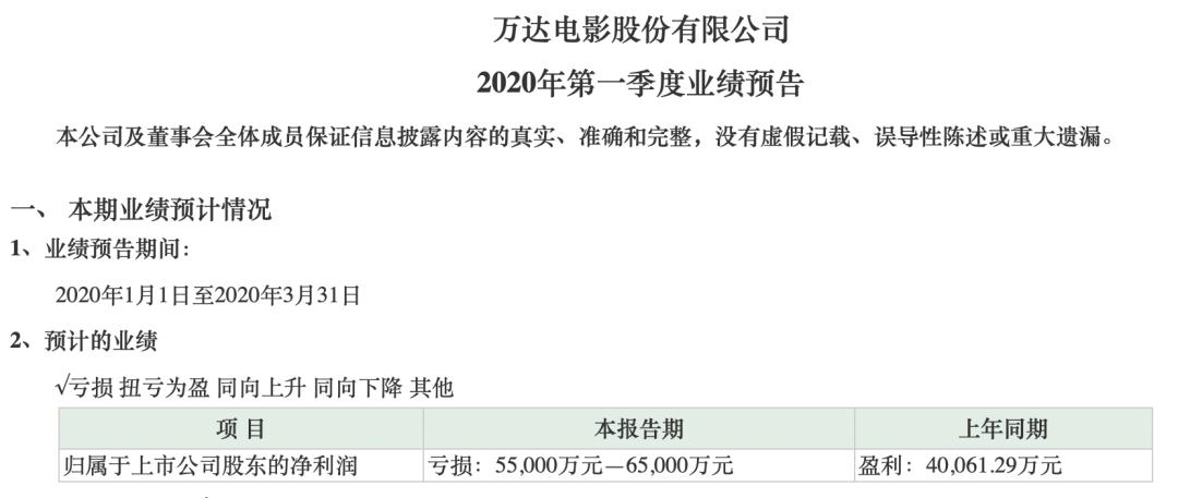 4月14日,万达电影对外发布2020年第一季度业绩预告,数据显示,万达电影预计今年一季度实现归属于上市公司股东的净利润为亏损状态,亏损规模在5.5亿元-6.5亿元之间。