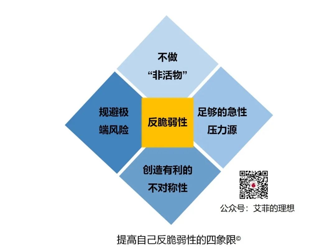 · 更高一层的原则:从四个维度提高自己的反脆弱性。 分别是:不做“非活物”、有足够的急性压力源、创造有利的不对称性以及规避极端风险。