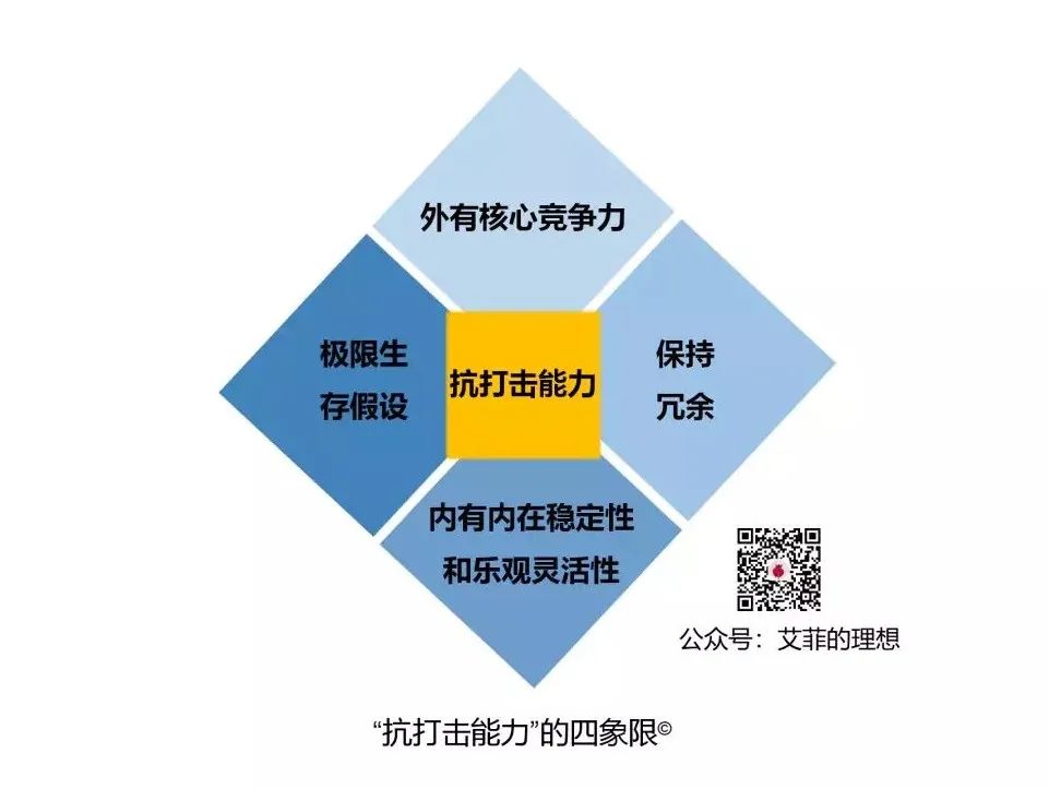 分别是:对外提高核心竞争力、对内修炼内在稳定性和乐观灵活性、保持冗余以及经过极限生存假设。