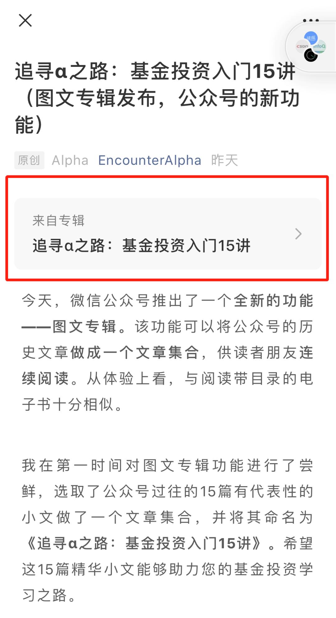 前文已经提过,专辑可在单篇文章内插入,在顶部显示。当公众号作者发布该文章时,如收编到专辑中,文章顶部便会显示:来自XX专辑。