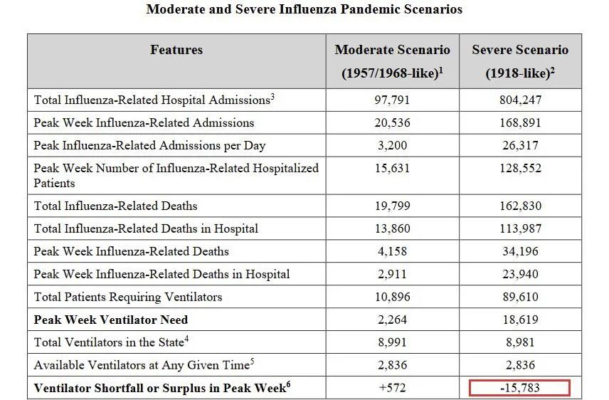 而在美国,呼吸机不足的问题早有警告。2015年,纽约州曾发布过一份长达272页的呼吸机分配指导文件[7],其中估算了流感疫情爆发时的呼吸机需求。