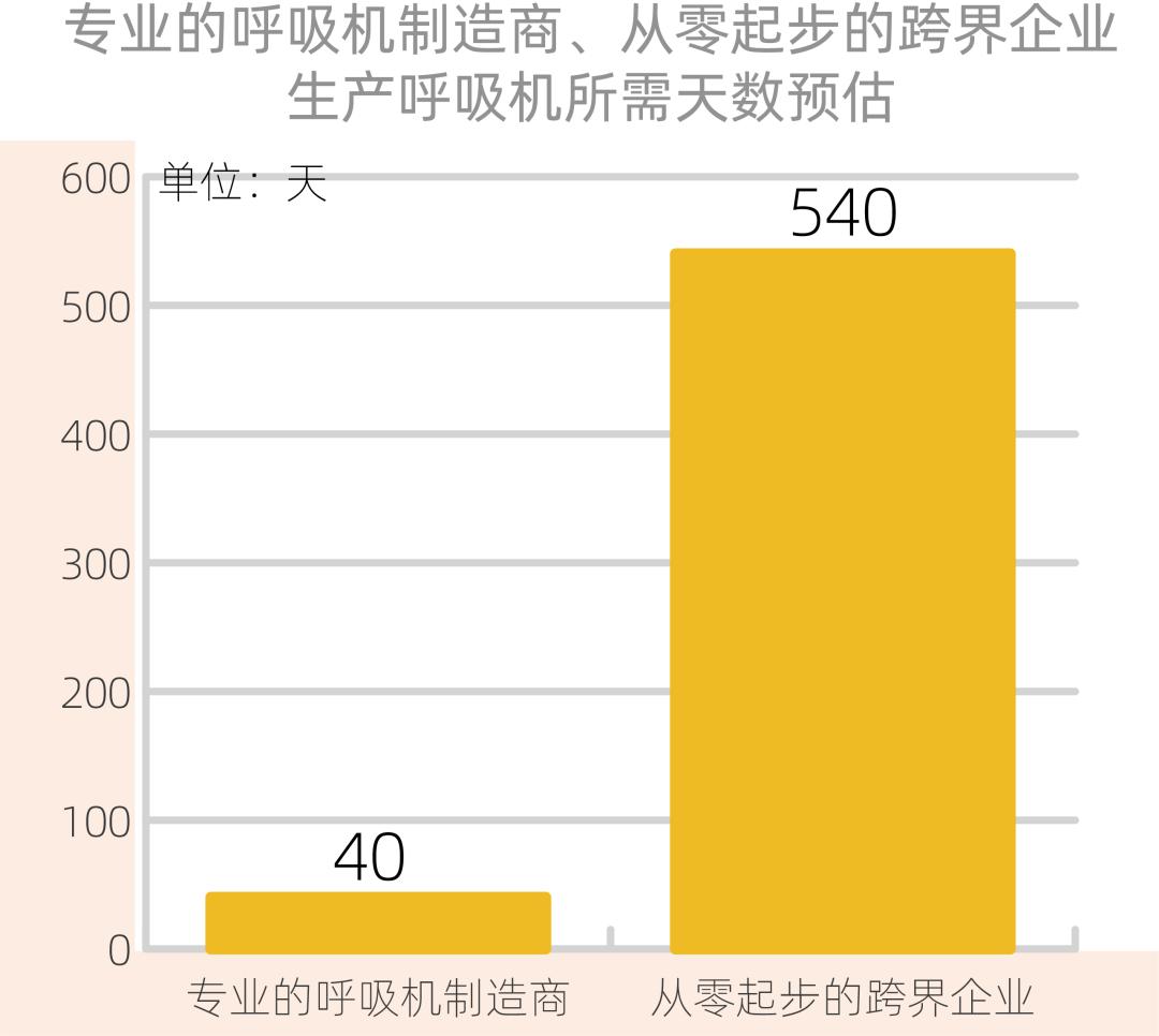 制造呼吸机,准备材料、生产线、人员与审批过程的时间远长于口罩。对于专业医疗设备制造商而言,生产一台呼吸机需要花费40天时间,而跨界企业从零起步则可能需要花费540天。