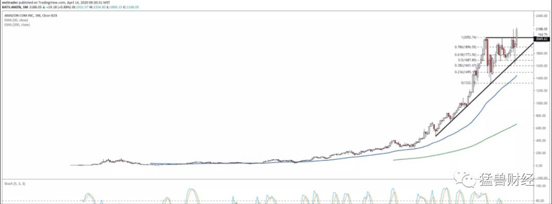 在2020年初,月度随机振荡进入了买入周期,但仍未达到超买水平,为更高的价格形成了强劲的推动力。此外,3月份的反弹始于2016年的上升趋势线,表明当前的上涨可能会在未来几个月增加很多点。2500美元看起来是一个合乎逻辑的上涨目标,但未来几个月该股可能会超过这一高位。