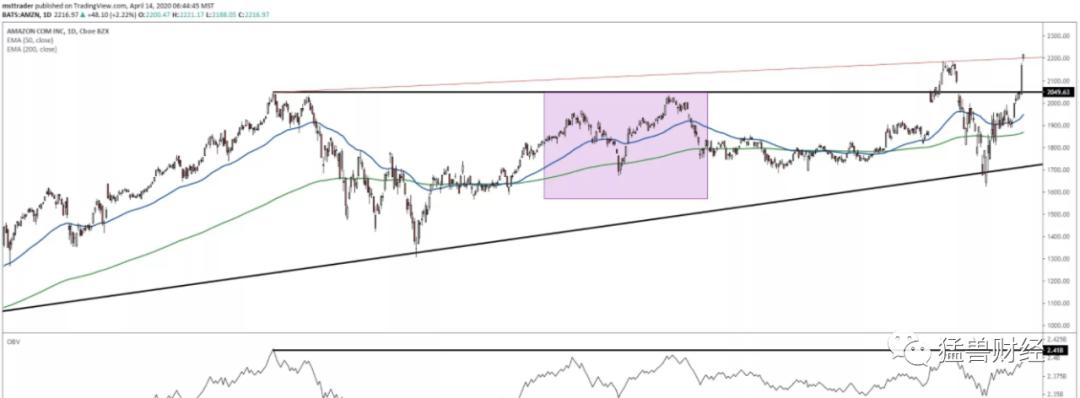 图表显示,亚马逊的平衡成交量(OBV)累计分布指标在2018年8月结束了长期买入阶段,并延续至年底。2019年4月和7月以及2020年2月的购买压力没有达到之前的高点,形成了可能在未来几周减缓或停滞进展的强大阻力。目前,市场人士应关注4月的缓慢上涨,寻找可能引发几周回调的疲态迹象。