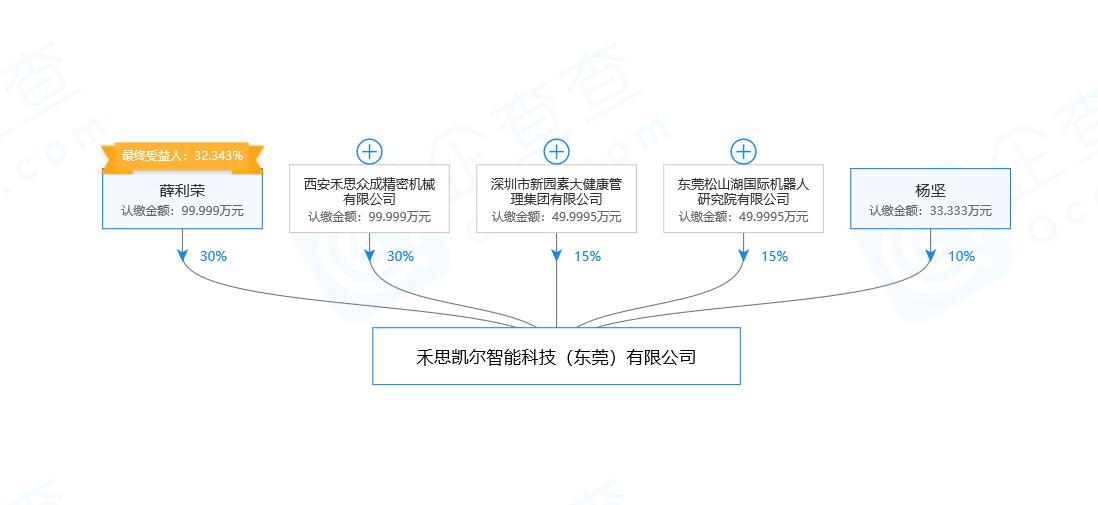 根据企查查信息,公司股东包括机构股东东莞松山湖国际机器人研究院有限公司、西安禾思众成精密机械有限公司、深圳市新园素大健康管理集团有限公司,自然人股东薛利荣、杨坚。