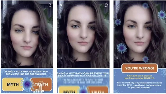 为有效破除有关疫情的谣言,Snapchat还增设了一个新的AR游戏,通过互动的方式,让用户获取正确的知识,以做好科学防护。