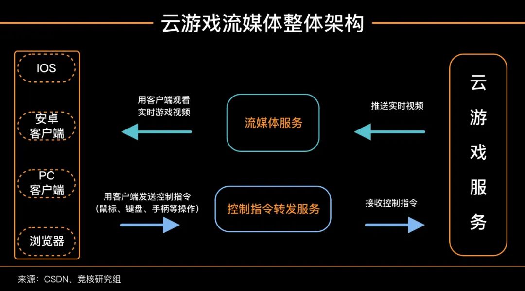 大体上,云游戏流媒体架构设计分为四端:1、云游戏主机端或者叫云游戏运行端、云游戏画面渲染端;2、流媒体服务;3、控制指令转发服务;4、客户端(浏览器、PC客户端、iOS以及安卓客户端等)
