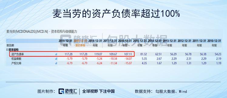 所以很多的企业债务非常之高,甚至是资不抵债。以麦当劳为例,从2016年开始,麦当劳的负债率就在100%以上了。