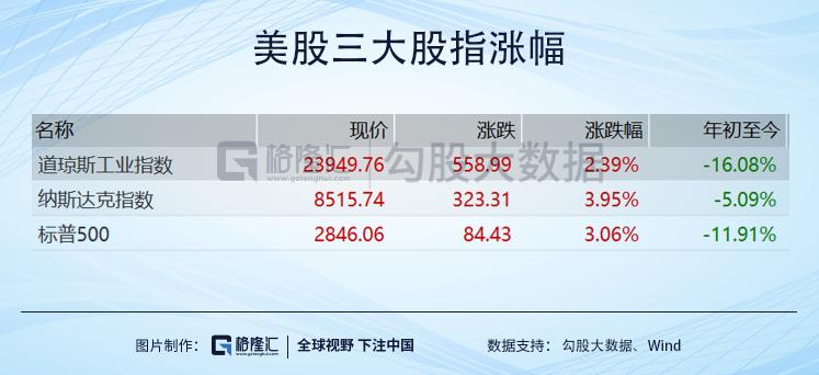截至4月15日早间收盘,道指上涨2.39%,报23949.76点;纳指涨3.95%,报8515.74点;标普500指数涨3.06%,报2846.06点。相较3月23日收盘价,美股三大股指较近期低点均已反弹超过20%,全面进入技术性牛市。