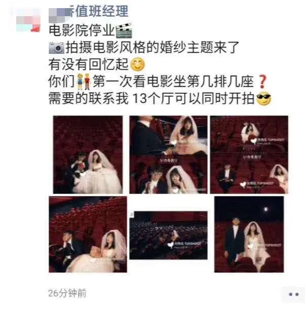 “本寄希望能做一些场地出租,比如播一播电竞或者做live演出,但现在线下演出管得也很严,这条路同样行不通。”北京市某影投负责人表示。而毒眸注意到,如今有些影院已经打起了场地出租的擦边球,开始承接起电影院主题的婚纱摄影项目。