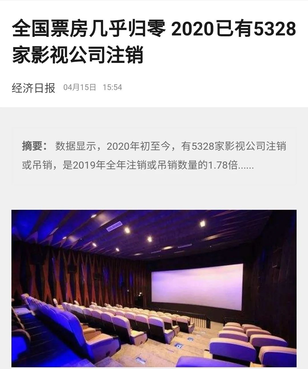 4月15日下午,中国疾控中心对外发布消息,称“要坚持控制人员流量,减少人员聚集。影剧院、游戏厅等娱乐性休闲型场所暂不开业;大型体育活动、展览展会暂不开展。”随后不久,便有不少影视类博主在微博上表示,有消息称影院或将在十月后才能恢复营业。