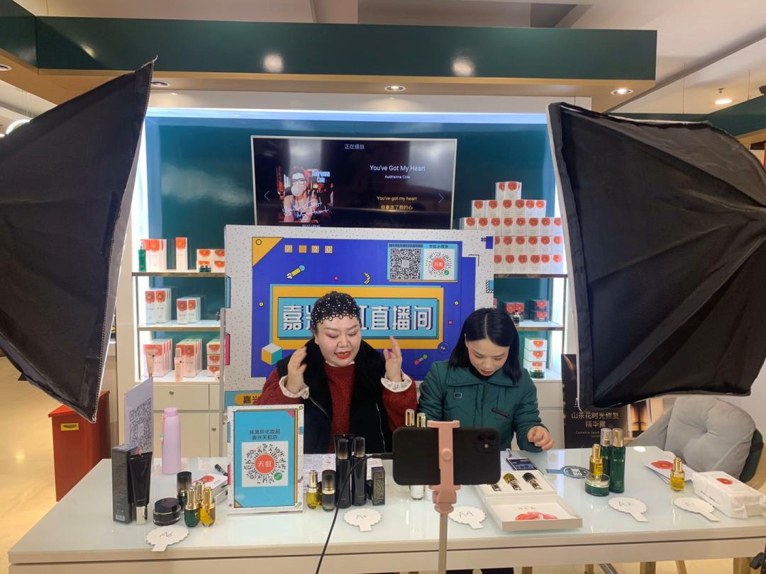 (嘉兴天虹店一位女主播在直播,菩萨头、弥勒佛小卷头贴,2小时卖出15万,创造林清轩浙江省第一名,图据天虹提供)