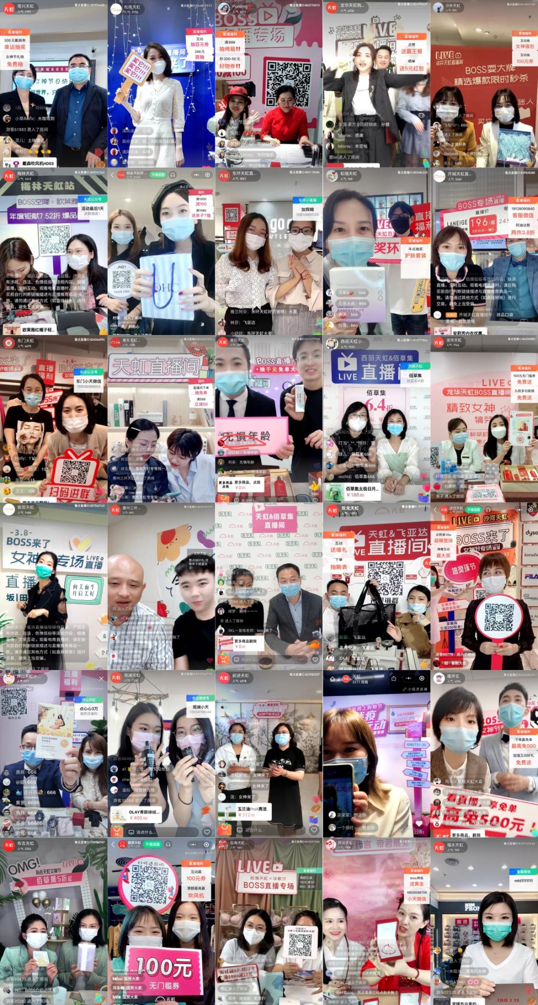 过去两个月,上千名天虹导购和业务负责人组成的“直播大军”,投入到一场专柜线上卖货自救行动,仅在38节期间,天虹便连续做出了数百场直播。
