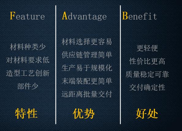 通过这样的推演,我们是不是对简洁两个字更有启发?从产品特性出发,到由产品特性带来的相对优势,最终给用户提供了价值,这是我们能够感受到的简单推演,这也是常规在营销策划里面的小套路,叫FAB的套路。