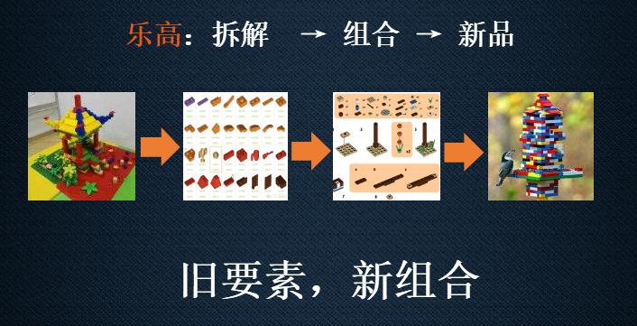 打个比方,这个是乐高积木,把左边积木搭的这个亭台楼阁拆散为一堆积木块,在这些零散的积木当中挑出可能需要增加一些新的组件,搭出右边的鸟巢。组合创新的精髓就是这6个字:旧要素、新组合。