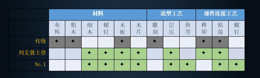 我们列出这样的一个表格,可以对比一下新旧椅子的区别,差异最大的是造型工艺。传统的工艺是雕刻、锯切,是手工活,新椅子的弯曲部件是索耐特专有的技术,可以用工具、设备、机械来完成。这样的话,对工人的要求更低,普通工人就可以做到。